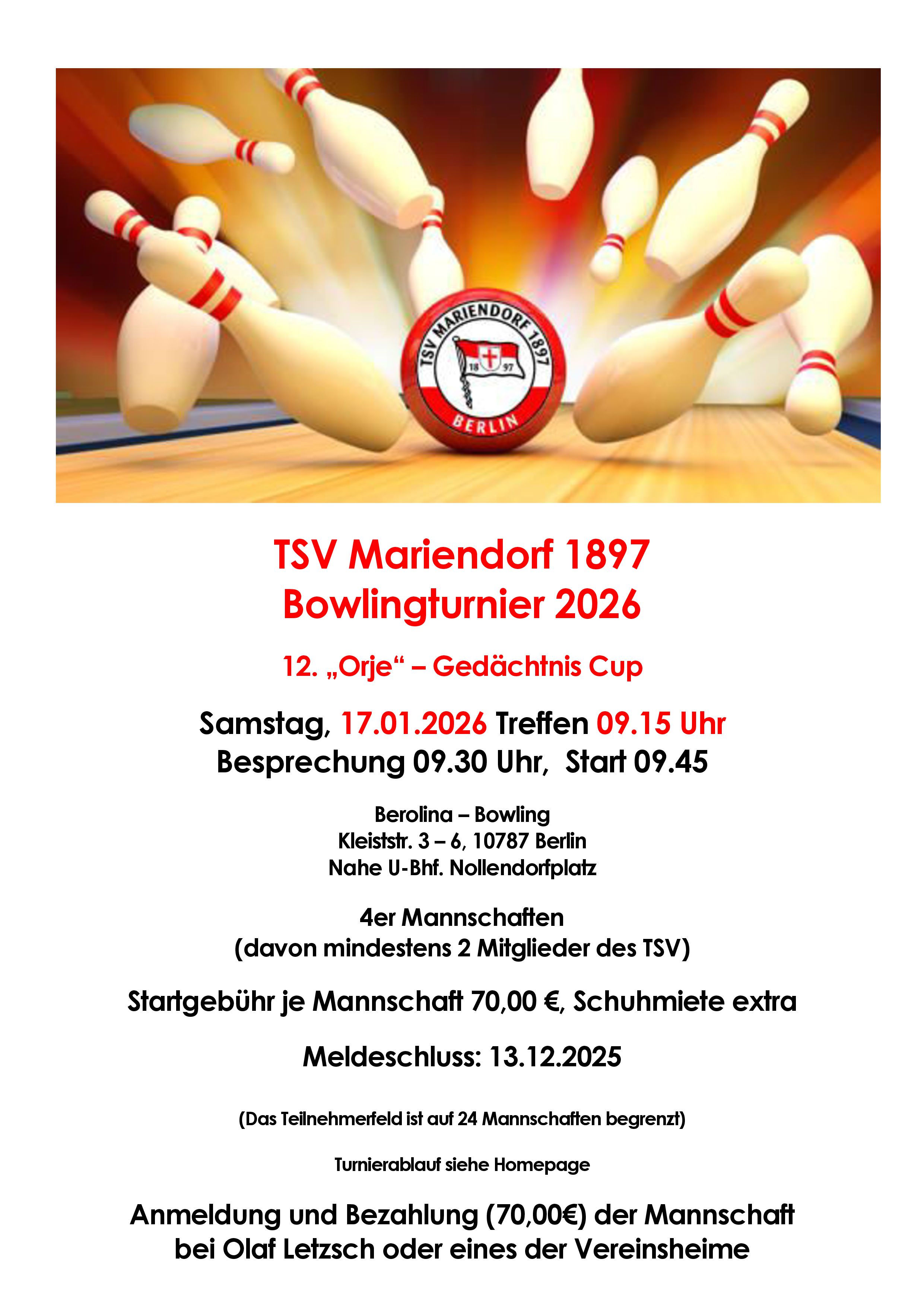Anfang Januar startet wieder das alljährliche Bowlingturnier des TSV Mariendorf 1897, das nach seinem verstorbenen Gründer "Orje" benannt worden ist.