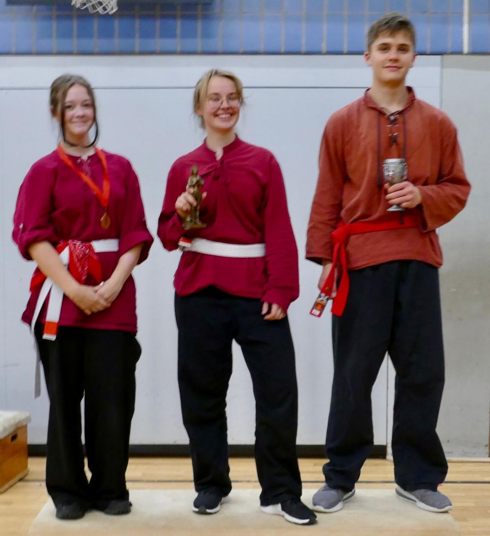 Unsere fantastischen drei Sieger der Vereinsmeisterschaft 2025 im Historischen Schwertkampf! Links Emilia (Kinder/U14), Mitte Josepha (Damen) und Rechts Yannick (Männer)! Die Vereinsmeisterschaft 2025 wurde in 5 Einzelkategorien im Doppel-K.O.-System ausgetragen: