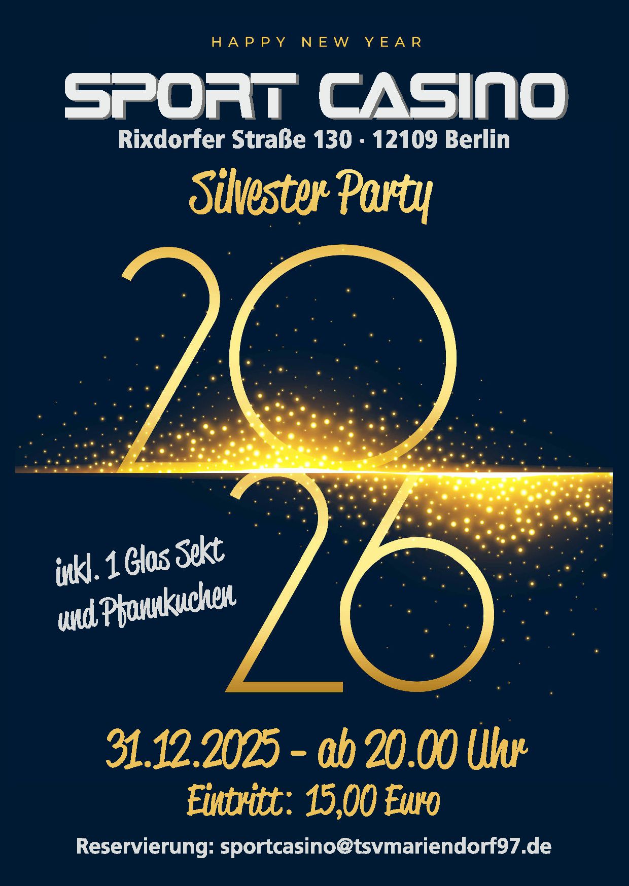 Bald ist das Jahr 2025 schon wieder Geschichte! Unsere beiden Vereinsheime, Der "Helgoländer Treff" im Volkspark Mariendorf und das "Sportcasino" in der Rixdorfer Str. 130, laden zu Sylvesterpartys ein. Meldet Euch rechtzeitig an und sichert Euch die Plätze!