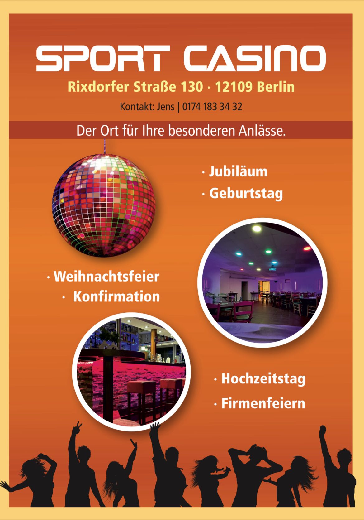 Ob Geburtstag, Mannschaftsabend, Konfirmation, Jubiläum, Weihnachtsfeier, Hochzeitstag, Firmen und Familienfeiern, nach der Renovierung ist unser Sportcasino in der Rixdorfer Str. 130, 12109 Berlin offen für jede Feierlichkeit. Kommt vorbei und macht Euch selbst ein Bild!