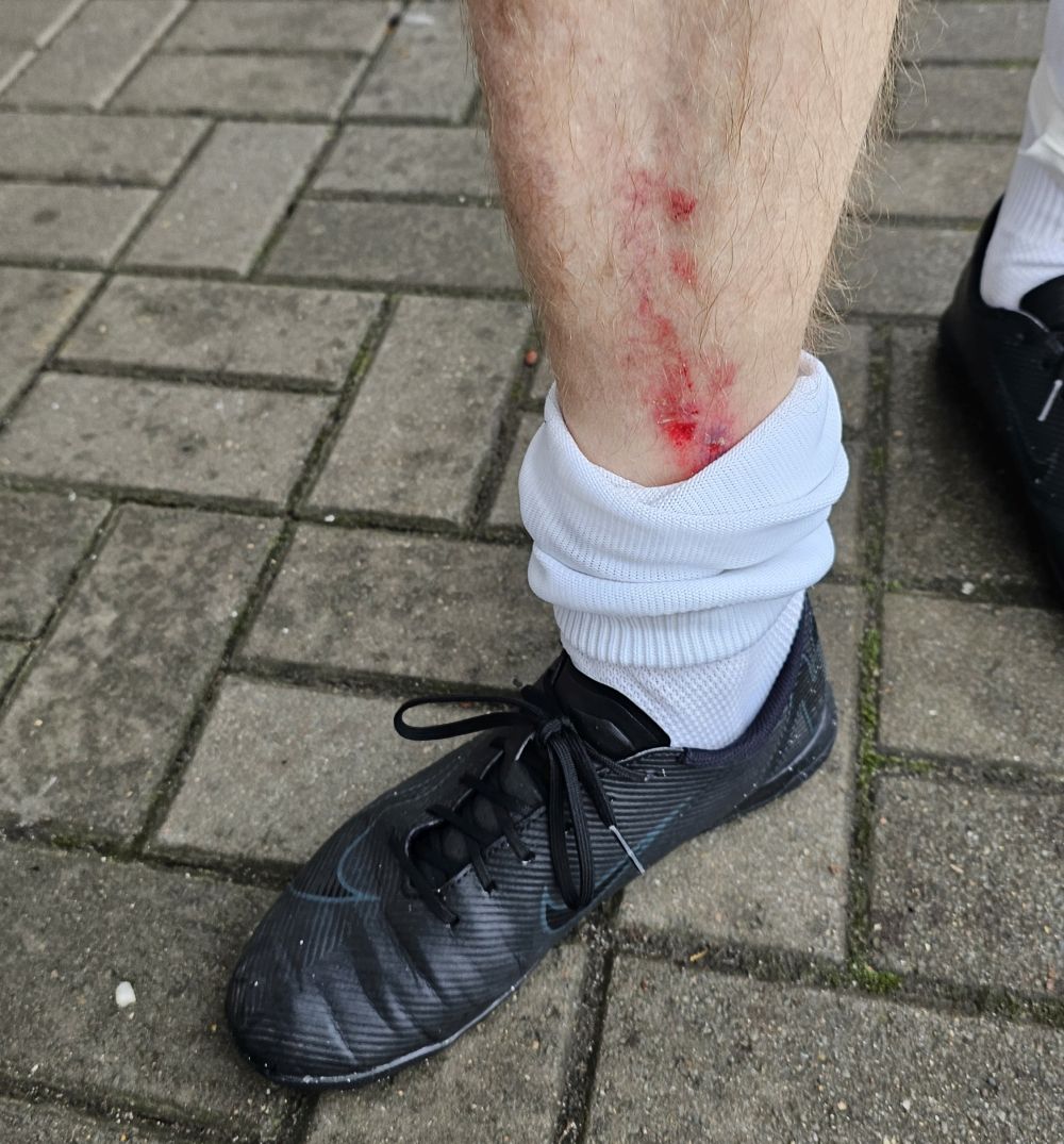 Zum Spielverlauf: Wir kamen besser ins Spiel und setzten Frohnau in ihrer eigenen Hälfte unter Druck. Ein blöder Abwehrschnitzer nach einem langen Einwurf führte zum überraschenden Rückstand (13.). Als kurz danach das Spiel länger unterbrochen werden musste, um unseren Spieler zu behandeln, der an der Mittellinie übel umgetreten wurde (siehe Bild), gab es einen Bruch in unserem Spiel. In der Folge leisteten wir uns insbesondere im Abwehrverbund zu viele Fehler, die Frohnau eiskalt zum 2:0 und 3:0 ausnutzte. Kurz vor der Halbzeit flog nach einem scharf getrenen Freistoss von Vale am zweiten Pfosten Yunus ein und verkürzte zum 3:1 Pausenstand, der noch mal Hoffnung gab.