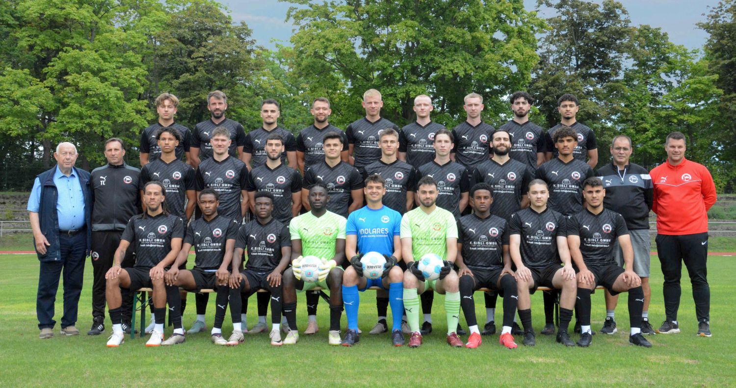 Mitte von links: Ehrenpräsident Nupnau, Trainer Thorsten Cornils, Rui Peixoto Cordeiro, Malte Fürst, Jannik Krieger, Daniel Veilert, A. Prasser, Jegor Kiuskins, Jusuf Yorguner, Bendrix Kadji, Betreuer Dirk Garnatz, Co-Trainer Stephan Schadow