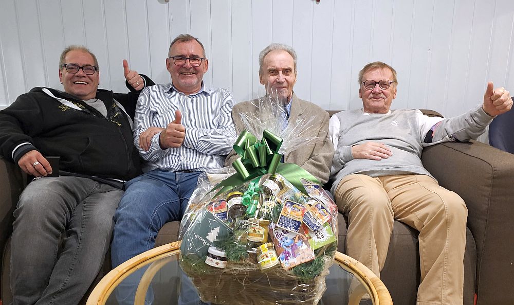 Anschließend wurden Mitglieder für langjährige Mitgliedschaft geehrt. Im Bild von links nach rechts: 25 Jahre Matthias Behrend (Abt. Car Racing), 40 Jahre Jürgen "Peggy" Peschel (Walking Football), 60 Jahre Günter Brockmann (Schiedsrichter Obmann a.D.), 60 Jahre Hans-Joachim "Fuzzy" Barnig (Ü 60).