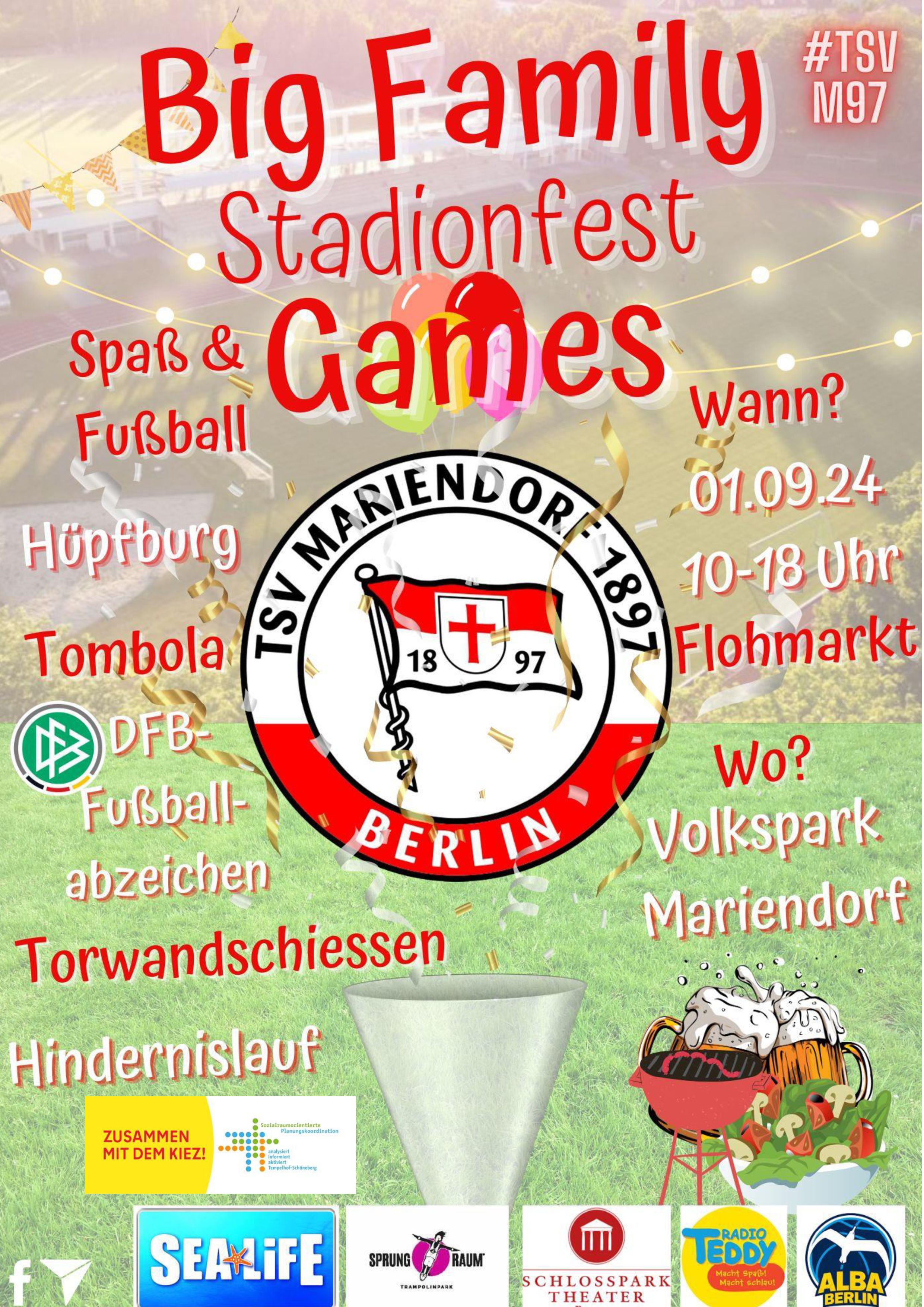 Zum diesjährigen Saisonauftakt freuen wir uns wieder auf ein Stadionfest im Volkspark Mariendorf und laden dazu alle Mariendorfer mit "Kind und Kegel" ein. Es gibt viel zu erleben: Torwandschiessen, erlange das "Spaß-Sport-Abzeichen" der Family Games oder das "DFB-Fußball-Abzeichen", Hindernislauf, Hüpfburgen und vieles mehr!