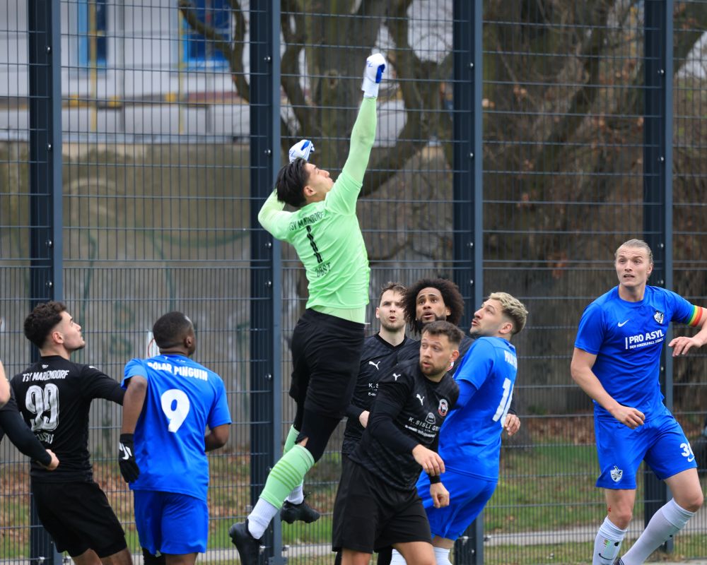 Im ersten Spiel des Jahres das im Volksparkstadion durchgeführt werden durfte gelang der Cornils Elf ein auch in der Höhe verdienter Sieg gegen die Sportfreunde aus Johannisthal. Der erste Treffer fiel bereits in der ersten Spielminute. Vincent Bühler ließ auf der Außenbahn seinen Gegenspieler stehen und passte so genau in die Mitte, dass der mitgelaufene Erik-Paul Pfannschmidt nur noch seinen Fuß hinhalten musste. Danach verpassten Krieger und Bühler das Ergebnis in die Höhe zu schrauben. Kurz vor der Pause fischte Pascal Obst (siehe Archivfoto aus dem Spiel gegen Polar Pinguin) den möglichen Ausgleichstreffer aus dem Winkel und war auch beim Nachschuss zur Stelle.