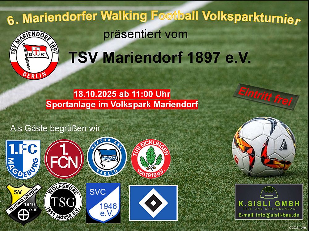 Mit Hertha BSC, Hamburger SV, 1.FC Nürnberg und dem 1.FC Magdeburg spielen gleich vier Erst- und Zweitligisten am Samstag, den 18.10.2025 beim 6. Mariendorfer Walking Football Volksparkturnier des TSV Mariendorf. Komplettiert wird das Feld mit dem SV Cramme, der TSG Mörse, SV Teutonia Köppern und TuS Eicklingen.